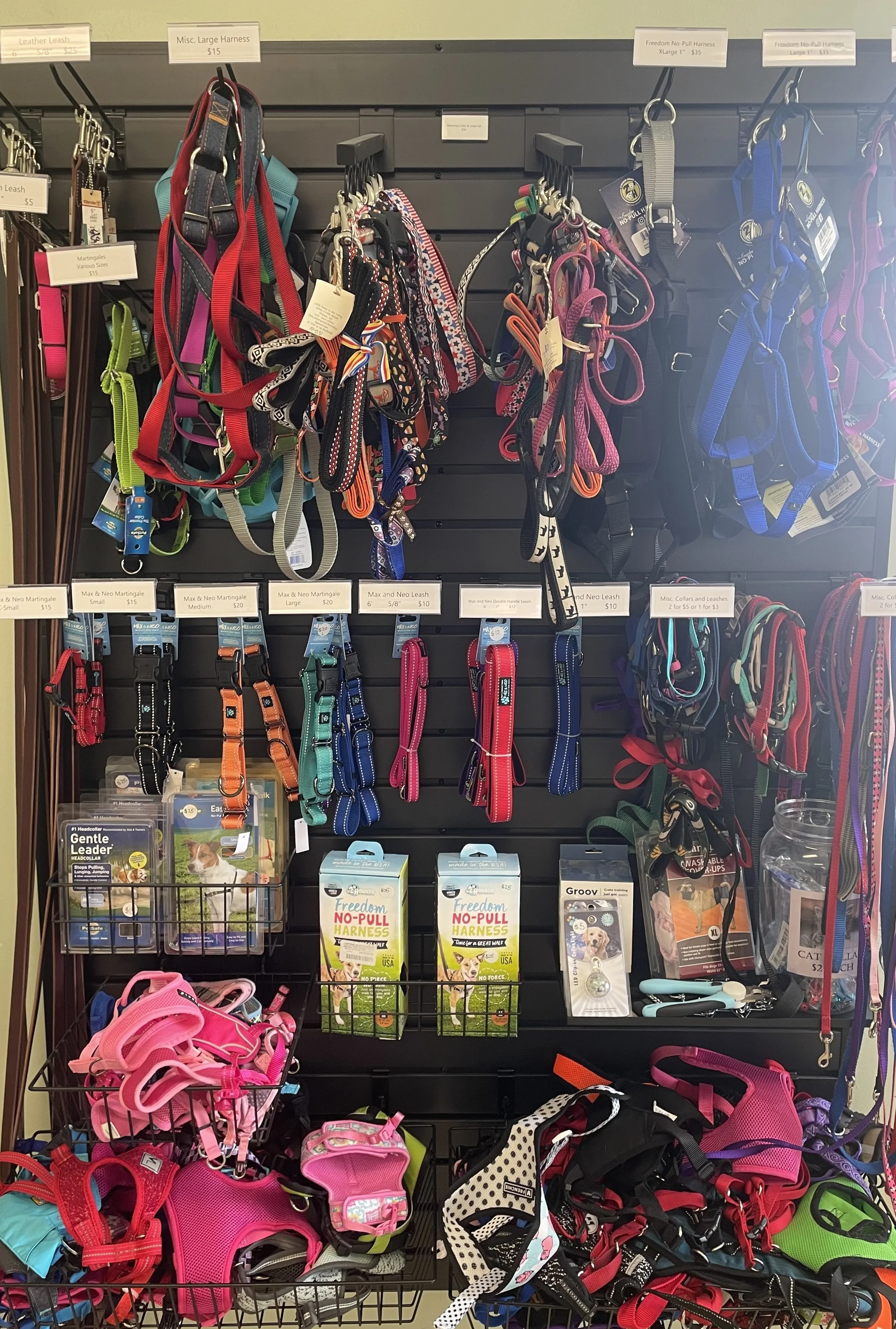 Stop by and visit our retail store located at Arnell Memorial Humane Society. We have a variety of different leashes, collars, harnesses, and basic supplies. The retail shop is open during our normal business hours.